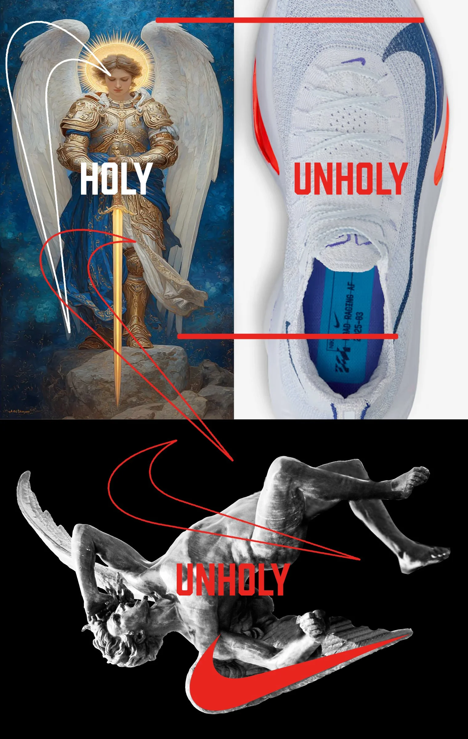I woke up around 2:15 am on September 17th… and had some time with God. I began thinking about NIKE and in my prayer to God He revealed we have been told that the NIKE swoosh represents the wing of the false goddess Nike… but what is false does not exist. So the NIKE swoosh more accurately represents what is real - Satan’s wing.