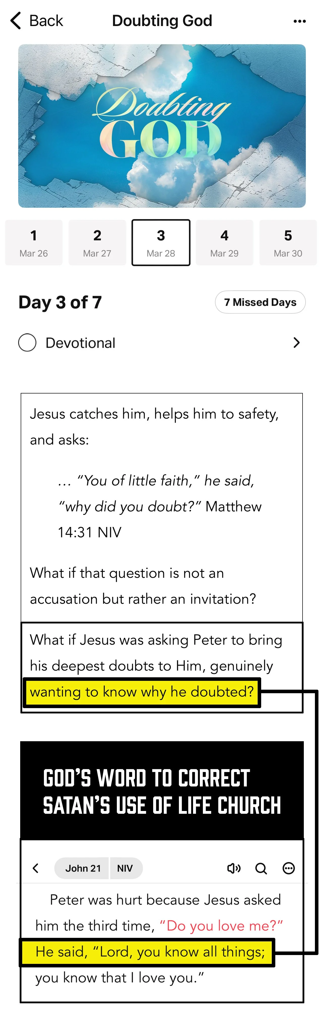 This is a “devotional” on the Bible app where Satan uses them to plant doubt about Jesus…
