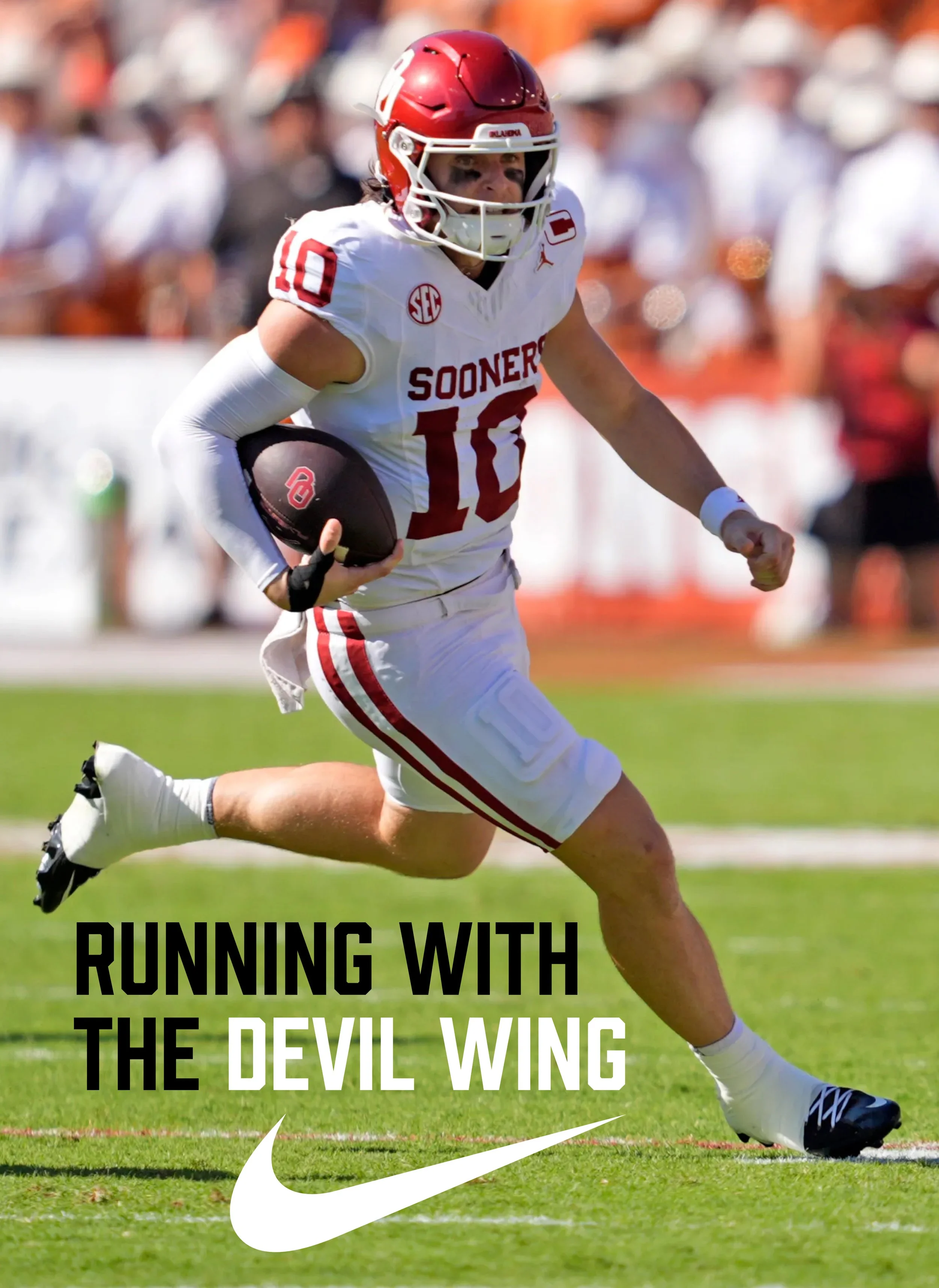 John Mateer of OU is shown wearing the NIKE wing of Satan.